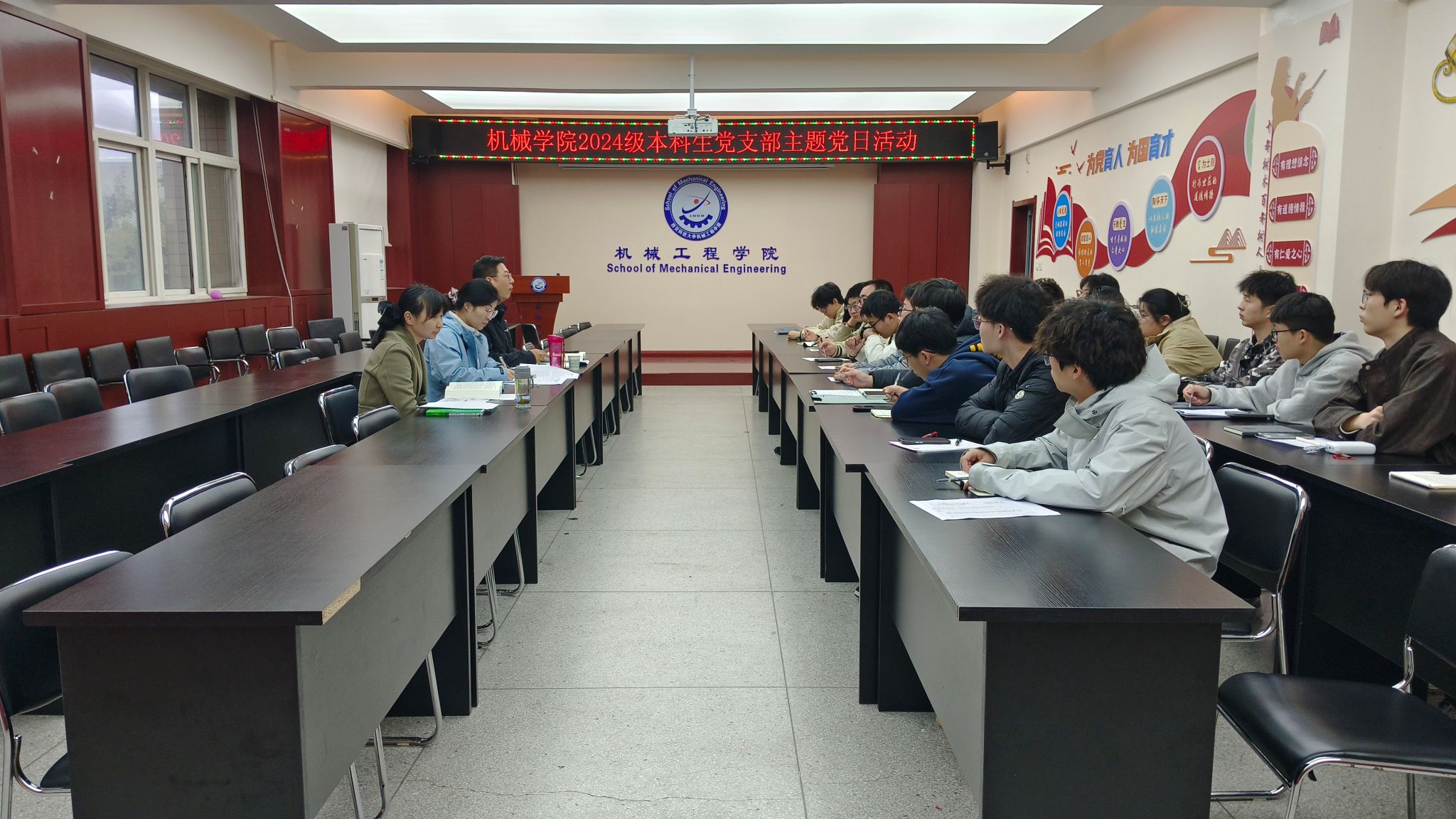 会议集体学习了党的二十届四中全会新华社社评《在接续奋斗中谱写中国式现代化新篇章》、习近平总书记给天津大学全体师生的回信、习近平总书记在庆祝中华人民共和国成立76周年招待会上的重要讲话精神、《习近平谈治国理政》(第五卷)以及《中国共产党思想政治工作条例》权威解读等相关内容。会上,支部成员郭小平同志结合学院学生培养实际,对《中国共产党思想政治工作条例》进行了解读,对支部党员和入党积极分子提出学习要求。他鼓励机械学子将党的二十届四中全会精神和《中国共产党思想政治工作条例》等内容的学习与专业知识学习、综合素养提升等深度融合,在日常学习中夯基础、练本领,在科创竞赛中强意识、报家国,在实习实践中察需求、知民情,将爱国情、强国志、报国行融入日常,坚持“干在实处,走在前列”,不断提高专业能力和综合素养,争做有理想、敢担当、能吃苦、肯奋斗的新时代好青年,为发展新质生产力、推动学院和学校高质量发展、谱写中国式现代化新篇章贡献青春力量。